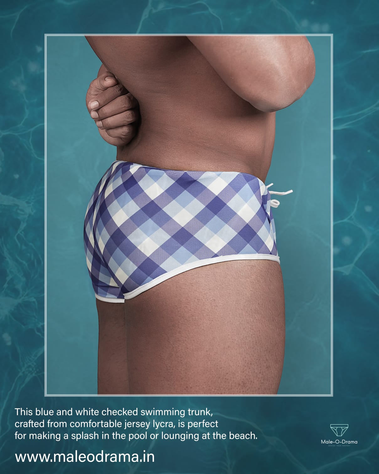 Made with jersey lycra and an adjustable drawstring, this beautiful swimming trunk in blue and white checkered print is both comfortable and stylish. Perfect for a day at the pool or beach, it's sure to make a statement.